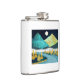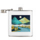 Ett vackert landskap med ett unikt struktur som visar ett flod- och bergslandskap med ett stigning måne och ett stjärnande himlar i skuggor av blått, guld, mörk grönt och gult.