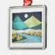 Ett vackert landskap med ett unikt struktur som visar ett flod- och bergslandskap med ett stigning måne och ett stjärnande himlar i skuggor av blått, guld, mörk grönt och gult.