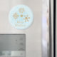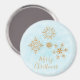 En magnet med en illustration av finare golden snöflingor med elegant kristallina former. En frostiskt ljusblå bakgrund. God jul står i texten.