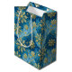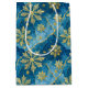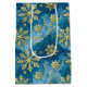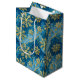 A field of golden snowflakes floats over a rich blue abstract background on this enchanting winter gift bag.