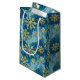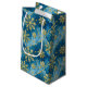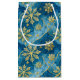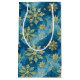 A field of golden snowflakes floats over a rich blue abstract background on this enchanting winter wrapping paper