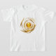 En grundläggande t-shirt i barn med en gyllene sol formad konstform biet med abstrakt snurrar runt den.