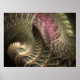 Fractal art showing a feathered golden spiral on a black background and pink and green details.