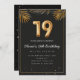 Luxury Golden Tropical Handflatan Lämnar 19:e Födelsedagsfest inbjudan. 19:e födelsedagsfest inbjudan i en svart och guld-ballonger med gyllene tropiska löv i handflatan. Anpassa med dina party-uppgifter och skicka ut e-post till familj och vänner och bjuda in dem att fira 19-årsdagen med stil!