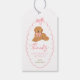 Celebrate your little one's big day with this adorable puppy party favor tag! Featuring a sweet golden doodle puppy with a pink bow. This tag is the perfect finishing touch for a "One Golden Year" or golden doodle first birthday party. Personalize it with your child’s name and use it for favor bags, gift boxes, or as a charming keepsake. Ideal for parents planning a puppy themed birthday or Let's Pawty! birthday for their little girl.
