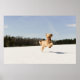 Entusiastiskt goldendoodle springa glatt genom ett fält i färsk snö under sen vinter.