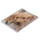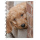 En berömvärd elva-veckans gamla Goldendoodle med smart öga gör nyfikna utfall från en dörr i en tegelvägg
