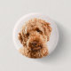 En studio porträtt av en gyllene doodle-hund tittar på kameran.