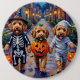 De berömvärda Goldendoodles som är klädda i lekfulla Halloween-kostymer bär pumpkiner medan de trillar eller behandlas under det månbelysta himmel. Denna festliga utformning belyser rasens fluffy curls, cheerful ansikte och lekfull personlighet, som perfekt fångar den spooky ännu roligt atmosfären från Halloween. Ett firande med hjärtan för hundälskare och Halloween fläkt.