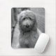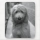 Ett vackert hårig Goldendoodle-valpen sitta på en bakgårdsbetong går längs en tegelvägg i svart och vitt.