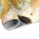Ein abstraktes Gemälde mit goldenen Flüssen, die sich durch die Farben Weiß, Rot, Blau und Schwarz schlängeln. Die dynamischen Muster entstehen durch die Technik des Fluid Paintings.