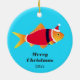 En roligt julprydnad med guldfisk i en jultomtskur. Ornamenten har ord "God jul" och ett anpassade år. Goldfish Santa Fish Animal jul Ceramic Ornamic Holiday Design | ©Melissa Patton - Artist/Illustrator
