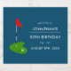 En enkel illustration av en röd golf-flagga, grönt och golf-boll på en mörk blått bakgrund på denna 50:e Födelsedagsfest-liquor-etikett för flaska. Anpassa etiketten med din väns, make, medarbetares, partners, etc. namn, och datum för födelsedagsfest.