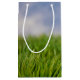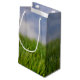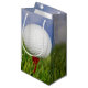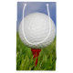 Vit golf boll på rödgrav i gräs med blå himmel.