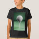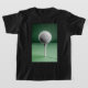 En vit golf boll på en vit T framför gröntens bakgrund.