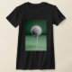 En vit golf boll på en vit T framför gröntens bakgrund.