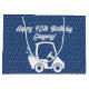Söt, vit golfbil med klubbor, anpassad Glad födelsedag hälsning (eller vad du vill att den ska säga) på en mörkblå bakgrund som har ett diamantmönster i vit överläggning. Perfekt för födelsedag, fars dag, svensexa eller bröllopspresent till brudgummens män.