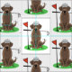 Golf Labrador Retriever - Lustigt chokladlab spelar golf på golfbanan, med en golfklubb i munnen, en golf boll och ett lock. Copyright © Angi Laframboise. Gjutna sportrelaterade gåvor till hundälskare och golfbanor i hund aveln.