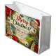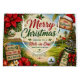 Full-scene modern watercolor illustration of Santa Claus golfing on a sunny Christmas day. He swings his club joyfully on a lush green golf course beside a turquoise sea lined with palm trees decorated with ornaments and fairy lights. Around him lie wrapped gifts, candy-cane golf tees, and festive flowers. The clear blue sky glows with daylight, and elegant gold watercolor script across the top reads “Merry Christmas.” The entire composition is bright, lively, and fully painted edge-to-edge — no white space or sunset tones, just cheerful tropical holiday energy.