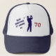 Denna födelsedag på hatt 70 visar en marinblå silhouettegolfare som tar en full gunga. Blåtten och den röda texten på antingen sida av de stilla avbildanågot att säga "KÖRA DEN HÅRT på 70". Sure att vara en konversationstartknapp för någon man som älskar för att leka golf!