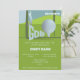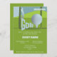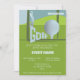 Denna fantastiska inbjudan till golfarrangemang har en fantastisk bild av en golfspelare och en stor golfboll med texten golf framför en fantastisk grön kulle i bakgrunden – perfekt för alla golfälskare eller golfklubbar där ute!