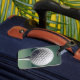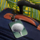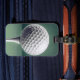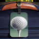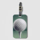 Bagagetagg med högkvalitativ bild av ett vitt golf boll på en vit fläck framför gröntens bakgrund.