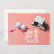 "Uttryck din tacksamhet med stil med vårt Baby Girl Golf Ball Thank You vykort! Med en charmig rosa golfbolldesign prydd med 'Tack' i elegant skrivstil är detta vykort det perfekta sättet att uttrycka uppskattning efter att ha firat vår lilla enes ankomst. Personalisera baksidan med ditt hjärtliga budskap till vänner och familj som gjorde vår dag speciell. Skicka en symbol för vår uppriktiga tacksamhet med detta bedårande vykort, som firar kärlek och stöd när vi välkomnar vår lilla flicka till världen."