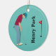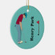 Teal personlig golfer, med hylsa, djup röd skjorta och blå byxor, som sätter en golf boll i en hål-julprydnad.