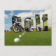 Bild är en golfbana med golf bollar och en golf-logotyp överst som är gjord med en golf klubbs-bild