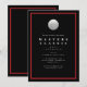 Elegant golfinbjudan med svart bakgrund, röd ram och en golfboll.
