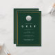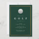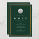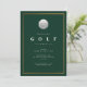 Enkel men elegant inbjudan med mörkgrön bakgrund, guldbård och en golfboll. Denna inbjudan skulle vara perfekt för födelsedagsfirande och professionella evenemang