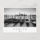 Foto vykort av en rad traditionella gondoler i vattnet med Venedig i bakgrunden i Italien i svart och vitt med en vit kant och texten 'Venedig, Italien'.