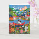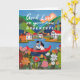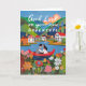 Charming illustrated greeting card featuring a romantic couple in a boat surrounded by colorful flowers, mountains, and a peaceful village landscape. Perfect for wishing someone good luck on a new adventure, move, marriage, life journey, or exciting new chapter. Original artwork by Caroline Bonne Müller