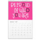 Bra visar en kalender med ett positivt budskap för varje månad på året i fet, tyst typografi. Framsidan och baksidan har en vit bakgrund med rosa och svart bokstäver i funkyn och innanför bakgrunden är färg genomgående i shock rosa med vit typografi med shock rosa och svarta högdagrar. Du kan ändra bakgrundsbilden om du vill genom att klicka för att anpassa ytterligare färg.