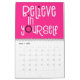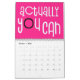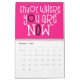 Bra visar kalendern med ett positivt budskap för varje månad på året i fet funky-typografi. På framsidan och baksidan finns en svart bakgrund och på insidan av shock rosa, med vit typografi med shock rosa- eller svarta högdagrar. Du kan ändra bakgrundsbilden om du vill genom att klicka för att anpassa ytterligare färg.