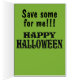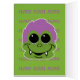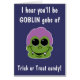 Mjuka leende har grönt, funky lila hår, fangs och stort sötningsmedel ögon. Goblin ansikte med text: Jag hör att du är GOBLIN gober av Bus eller godis godis. Inomhusskydd: ansikte över nom nom nom-mönstrad bakgrund. Spara lite för mig!! Happy halloween! Det här är ett roligt-kort för dina favorithemligheter Halloween!