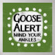 En oåterkallelig konstig typografisk djurdesign som säger "Goose Alert, Mind Your Ankles". Den har svart och röd text på en vit rektangel med funky, lekfulla vita prickar runt den, allt på en grått-bakgrund.