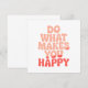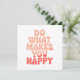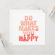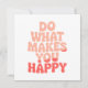 Gör någon till sin dag med det här trevliga och upplyftande hälsningskortet med den inspirerande frasen "Gör det som gör dig Lycklig" i sjudande, färgstarka bokstäver. Oavsett om du presenterar det för en vän eller använder det som en vardaglig påminnelse om att leda med vänlighet, ger den här designen ett budskap om uppmuntran, glädje och bra vibes.