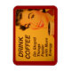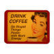 Sömmande kvinna med retrorött läppstift och nagel dricker hennes kopp av morgonkaffe. Rubriken lyder "Drick kaffe - Gör Sak snabbare med mer energi".