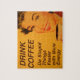 Sömmande kvinna med retrorött läppstift och nagel dricker hennes kopp av morgonkaffe. Rubriken lyder "Drick kaffe - Gör Sak snabbare med mer energi".