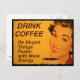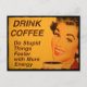 Sömmande kvinna med retrorött läppstift och nagel dricker hennes kopp av morgonkaffe. Rubriken lyder "Drick kaffe - Gör Sak snabbare med mer energi".