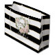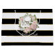 Modern design, djärv svartvit sned boll görat randig mönster med guld- glitterlist för liten faux och en räcka målad blom- kran som göras av vit- och rodnadrosa ros med vining gren- och rosa- och vitvanlig hortensia. Några lavendelFreesias tuckeds också in tillsammans med suckulent lövlövverk samla i en klunga. Ett typografitextmeddelande läser "så lyckligt för dig två!", och de brud- och brudgum namnen är personifierat nedanfört. Konst tar copyrightt på Audrey Jeanne Roberts som all rättigheter reserverade.