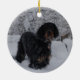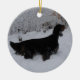 Gordon Setters i en Snowstormprydnad. Dubbelsidig prydnad som presenterar en äldre Gordon på en sida och en Gordon valp på annan. Båda hundar som står i djup snö, fördriver snönedgångar.