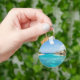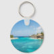 En nyckelkedja med ett vackert foto med en tropisk strandort. Söt blå stranden vatten och vit sandstrand med överskötta hinnor ge det en stillastående övibe.