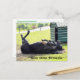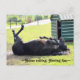 Ett vykort med ett foto av en underbar, svart häst som rullar i sanden och som har roligt.
