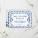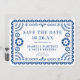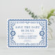 Denna vackra papelpiado inspirerade bröllop spara datum-design har en ornerad ram och text i blå, vit bakgrund och modern typografi. Den här eleganten är ändå ett fantastiskt val för ett latinskt bröllop- eller Mexiko-bröllop. På baksidan finns ett eget "fullt-utfall"-vågrät som kan tas bort om du vill.