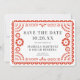 Denna vackra papelpiado inspirerade bröllop spara datum-design har en varm röd ornat ram, mörk grått-text, vit bakgrund och modern typografi. Den här eleganten är ändå ett fantastiskt val för ett latinskt bröllop- eller Mexiko-bröllop. På baksidan finns ett eget "fullt-utfall"-vågrät som kan tas bort om du vill.