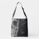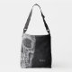 Gott makabre svart och vit coola grunge struktur skriver ut halverad skallkorsning i korsningspåse. Spooky, läskigt, ondskefullt, ondskefullt. Anpassningsbar Goth-skript till kostym för dina behov. Trendig, unikt, modernt, läskigt Halloween-inspirerat design. Upphovsrätt Marg Seregelyi Fotography.
