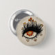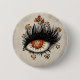 Knappen konstig öga med en digital illustration av ett kvinnligt öga med bruten iris av lava och långa ögonfransar som slutar i bisarblommor med vinklade petaler i ett grumligt grått himlar.