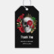 Tack för att du föredrar taggar med en bra illustration av stil. Vackert röd ros och guld lämnar runt ett svart och vitt skalle.